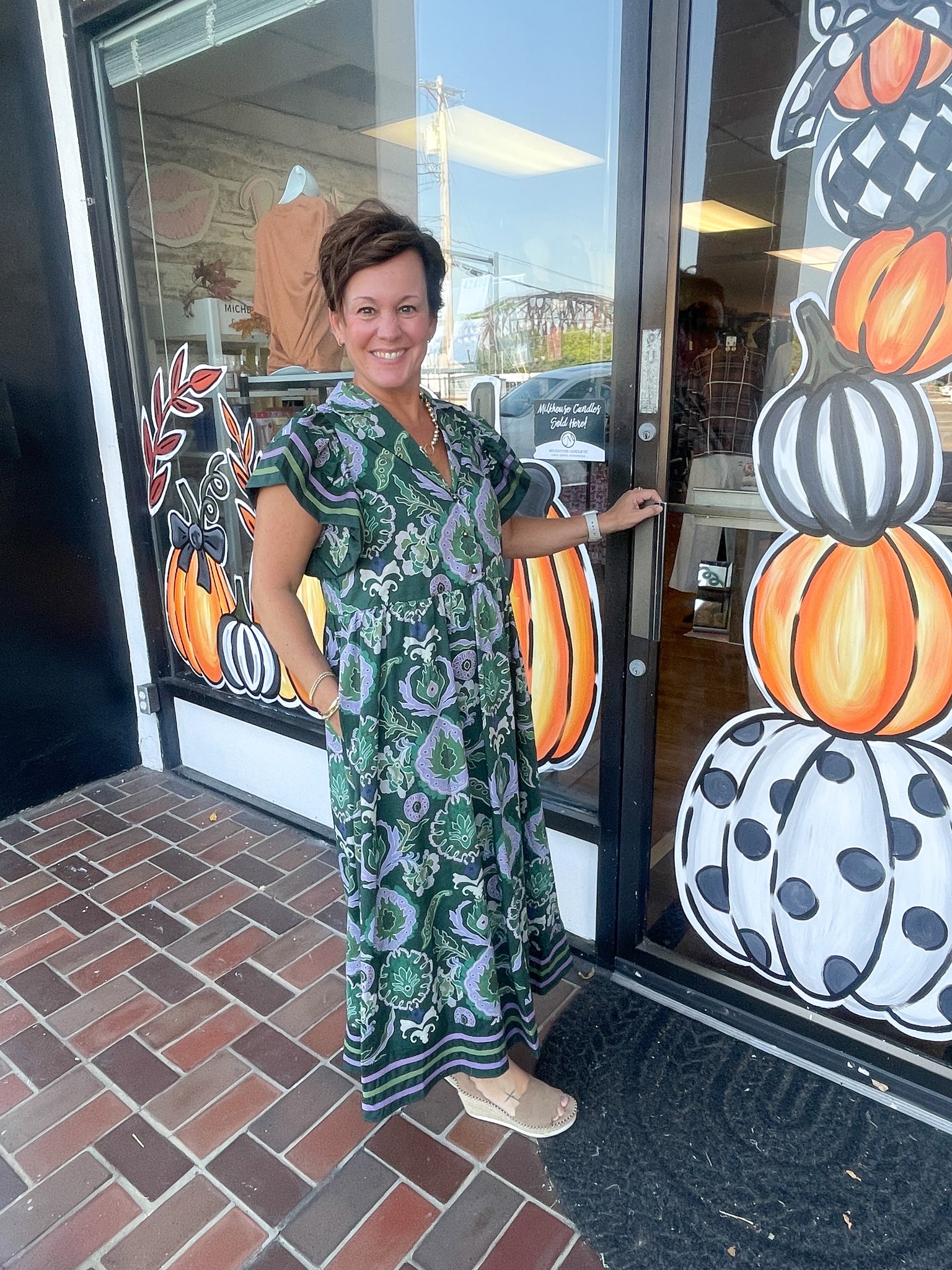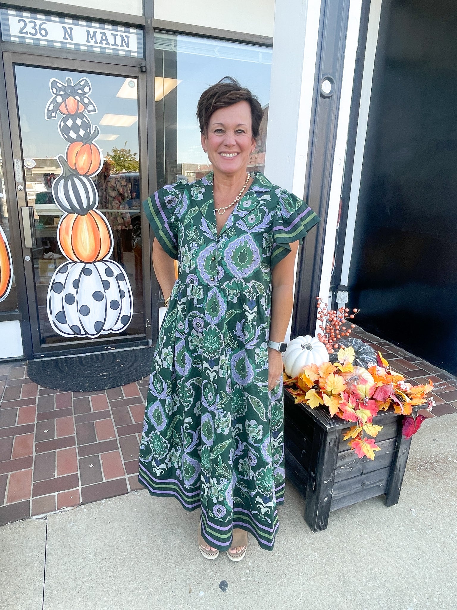 This lightweight woven midi dress combines multiple prints with contrast accent binding for a fresh, stylish look. Featuring flutter sleeves, a lapel collar, and a button-front closure, it offers both elegance and ease. Fully lined for comfort, it includes convenient side pockets, making it perfect for day-to-night wear.