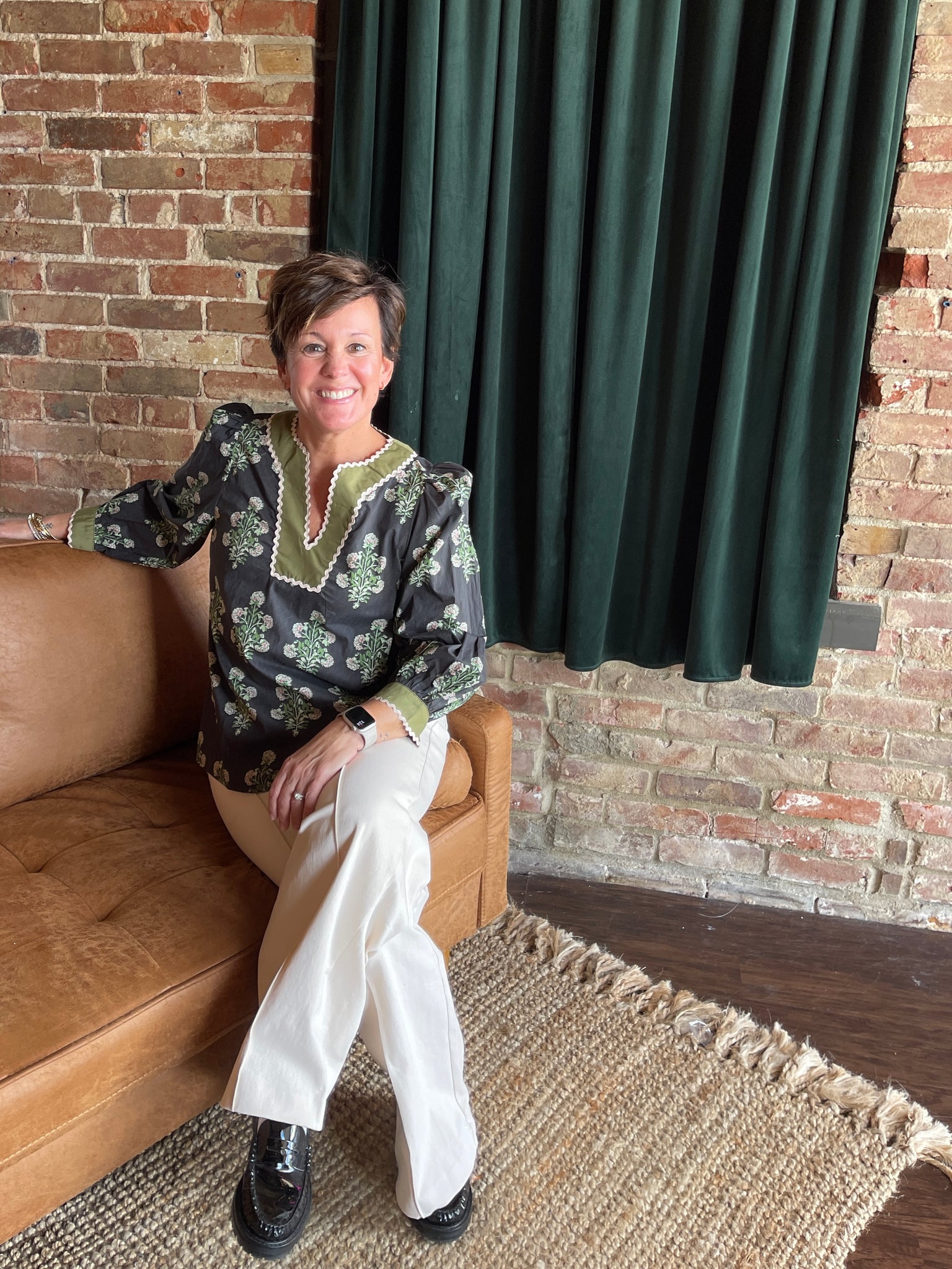 This elegant floral print top features a multicolor accent V-neck paired with a chic band collar, creating a refined silhouette. Crafted from lightweight woven fabric, it offers comfort and breathability, while the 3/4 bubble sleeves add a subtle, stylish volume. Ideal for fall, this piece combines sophistication with effortless wearability.