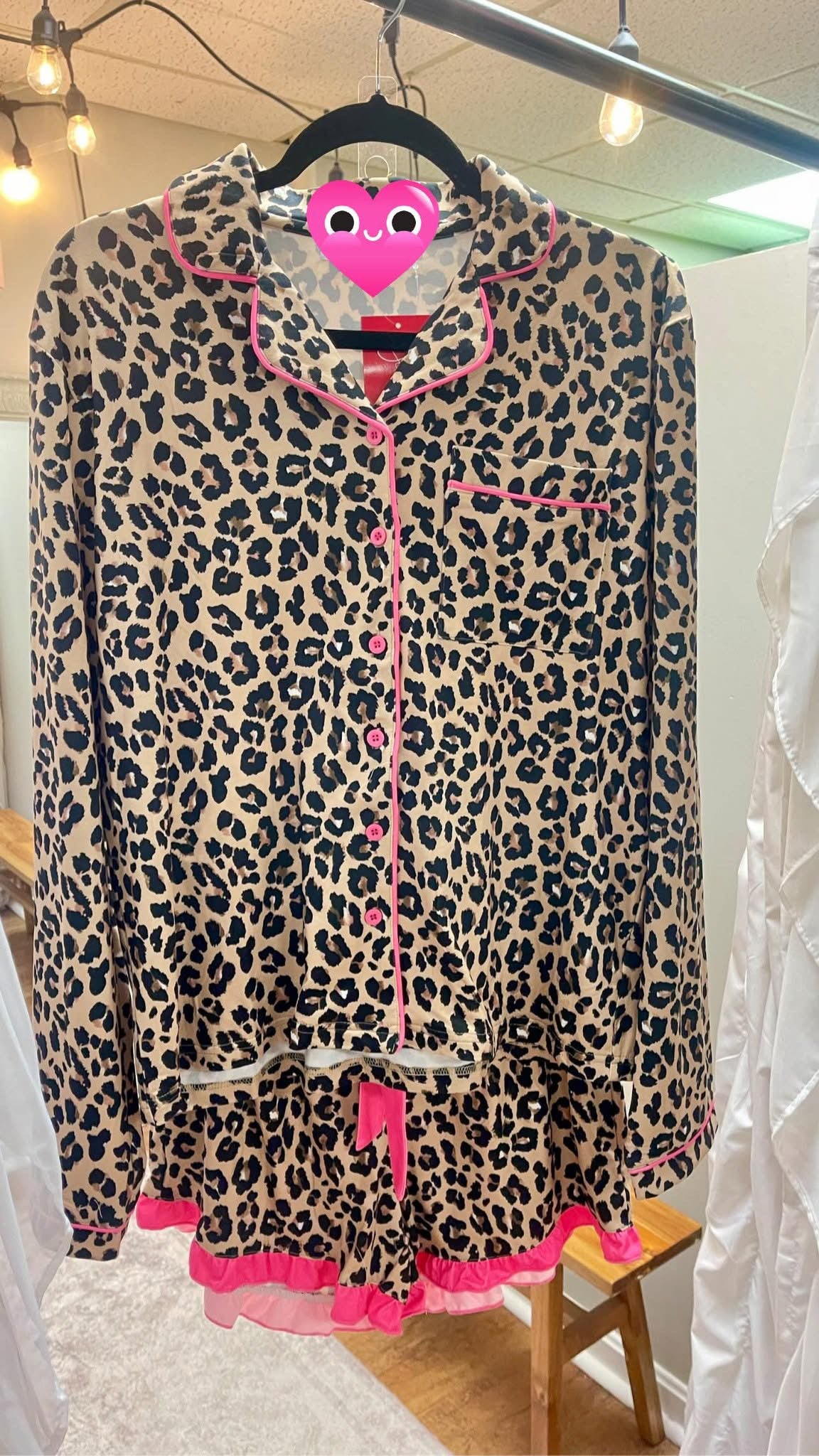 Slip into cozy luxury with this Luxe Leopard Pajama Short Set. Featuring a bold leopard print with hot pink accents, this two-piece set pairs a long sleeve top with ruffled shorts for effortless style. Crafted from a butter-soft blend of 96% polyester and 4% spandex, it's breathable enough to keep you cool while delivering maximum comfort all night long.