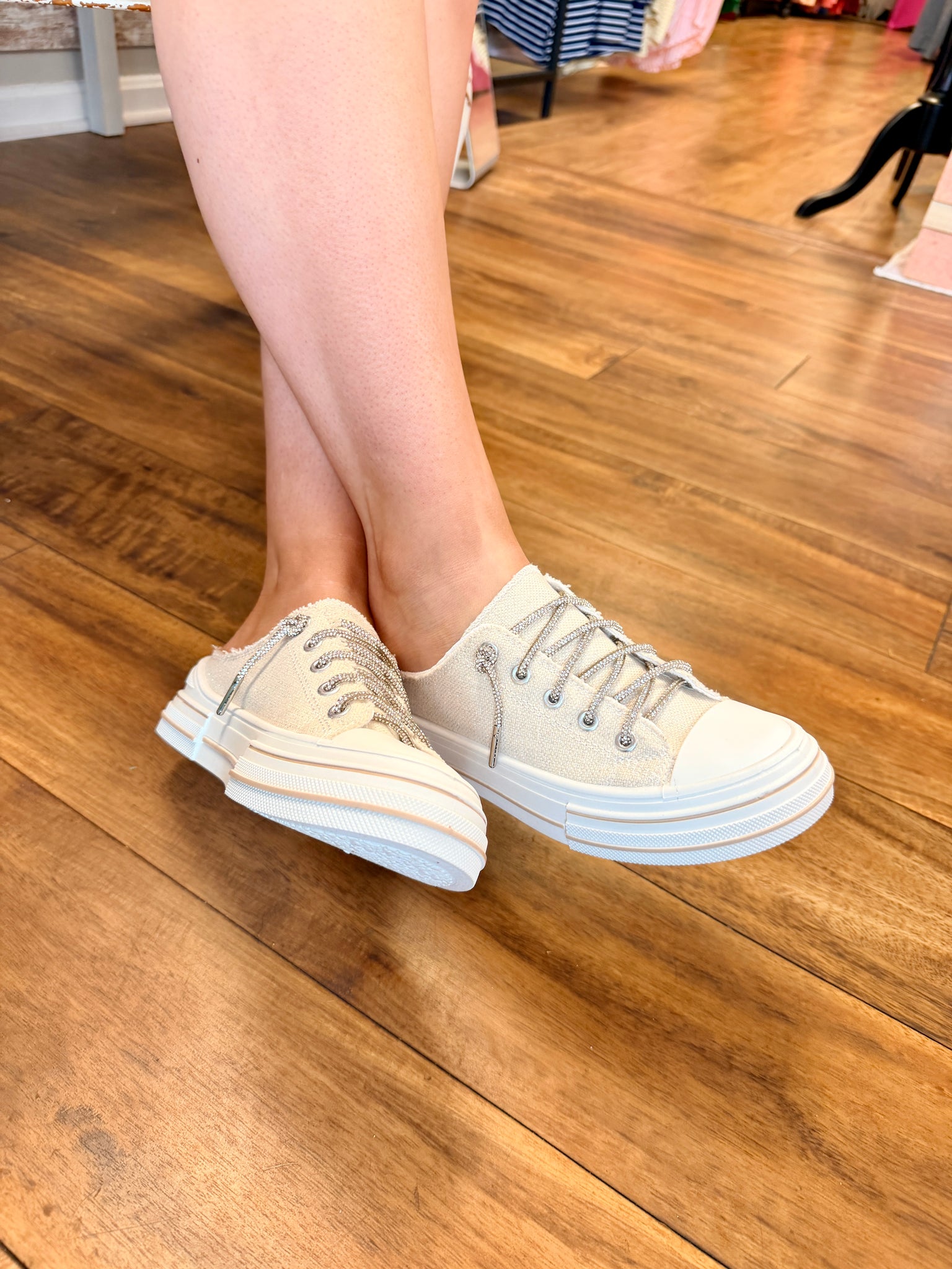 These fun sneakers with rhinestone laces are a must-have for any wardrobe! True to size and with a comfortable cushion footbed, they pair perfectly with shorts, jeans, and dresses. Plus, everyone needs a cute white sneaker!