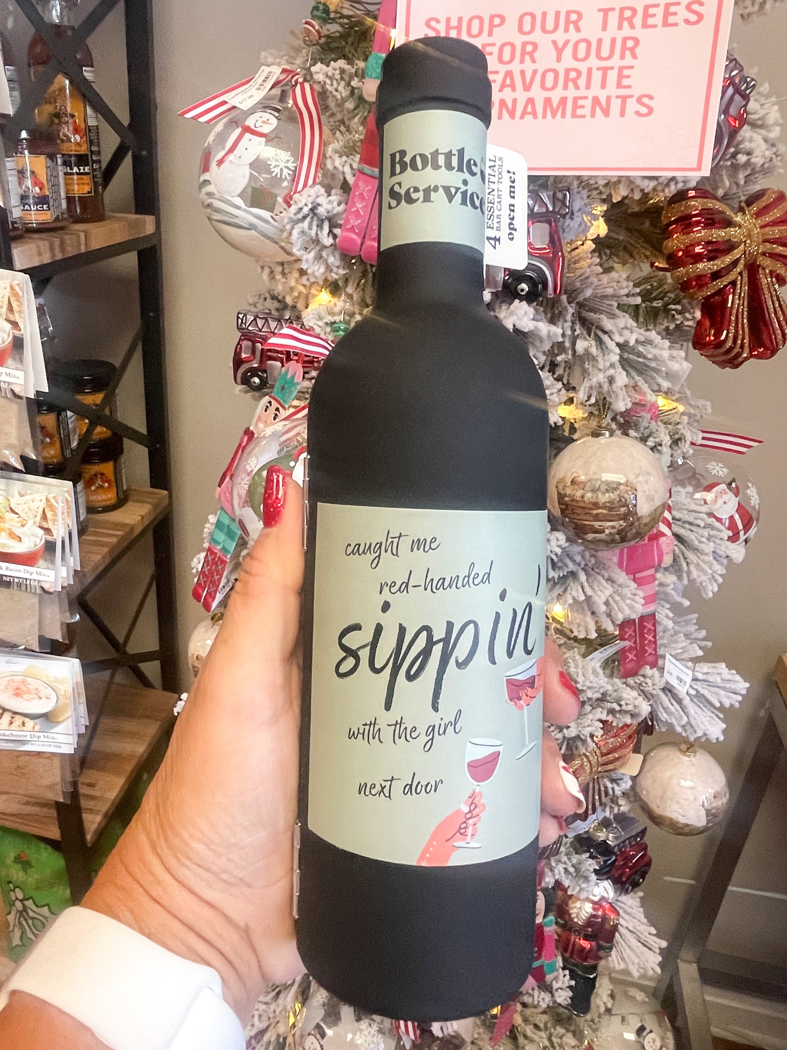 Bottle-shaped case includes: • Bottle stopper • Corkscrew • Bottle opener • Foil cutter • Punny labels inspired by hit throwback songs • Makes a great gift & bar cart display!