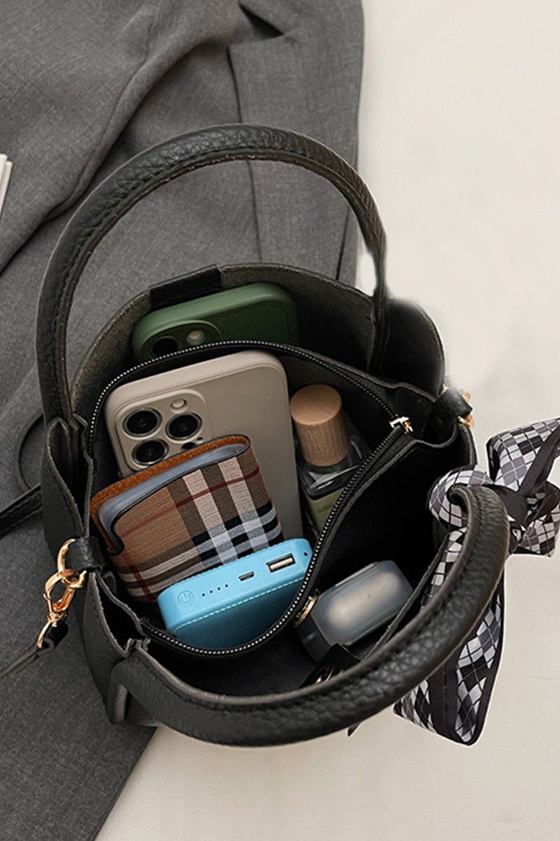 This black vegan leather crossbody is your trendy spring essential. Clean modern lines, gold accents, and multiple compartments with dual magnetic and zipper closures. Includes matching AG scarf. 7.87" L x 6.7" H x 4.33" W.
