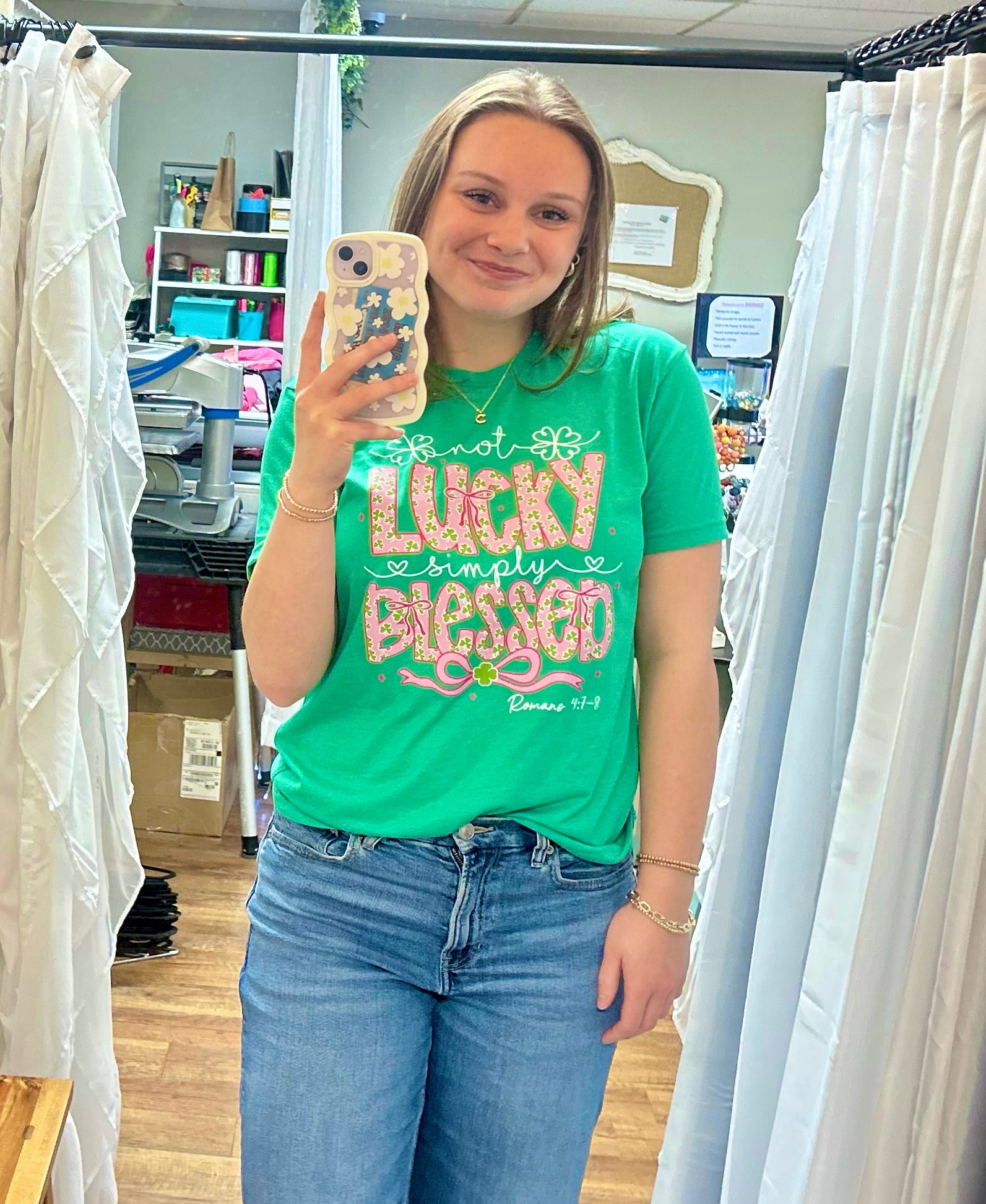 Celebrate St. Patrick's Day in style with our Not Lucky Simply Blessed Unisex Soft Tee! This adorable pink design on a kelly green tee is perfect for spreading love, positivity, and good vibes. Show the world that you are blessed and lucky every day. Be comfortable and stylish with this must-have tee.