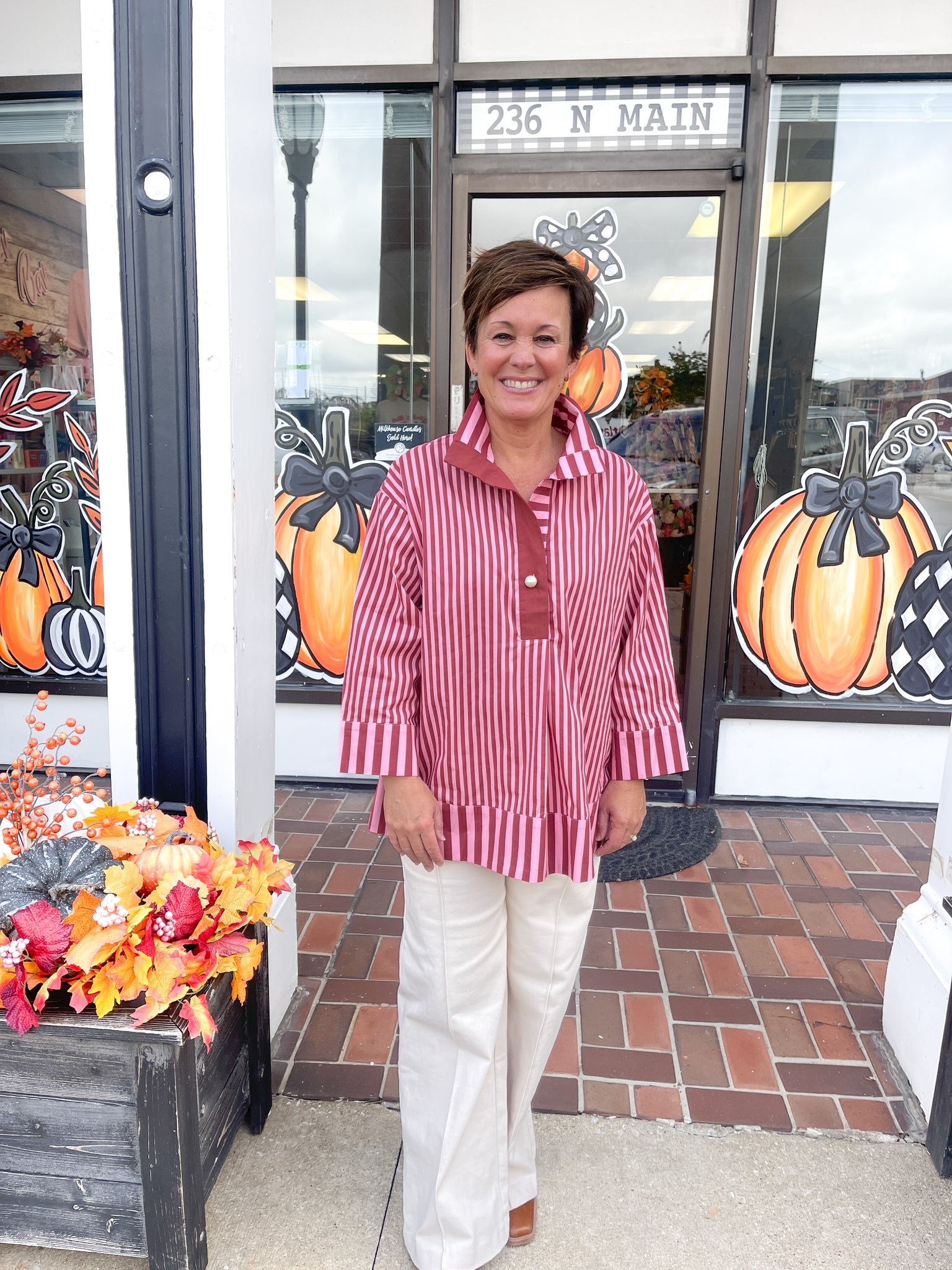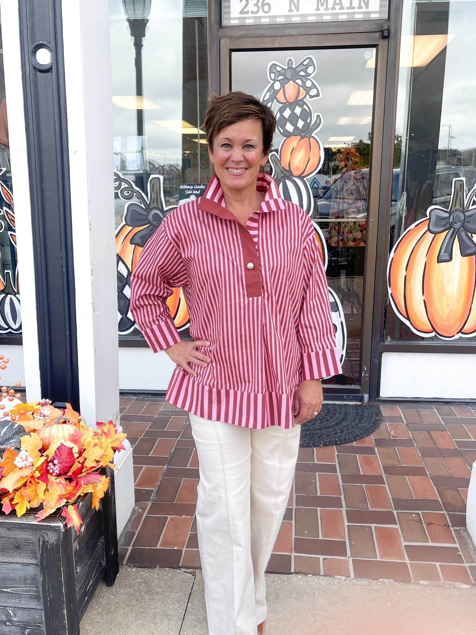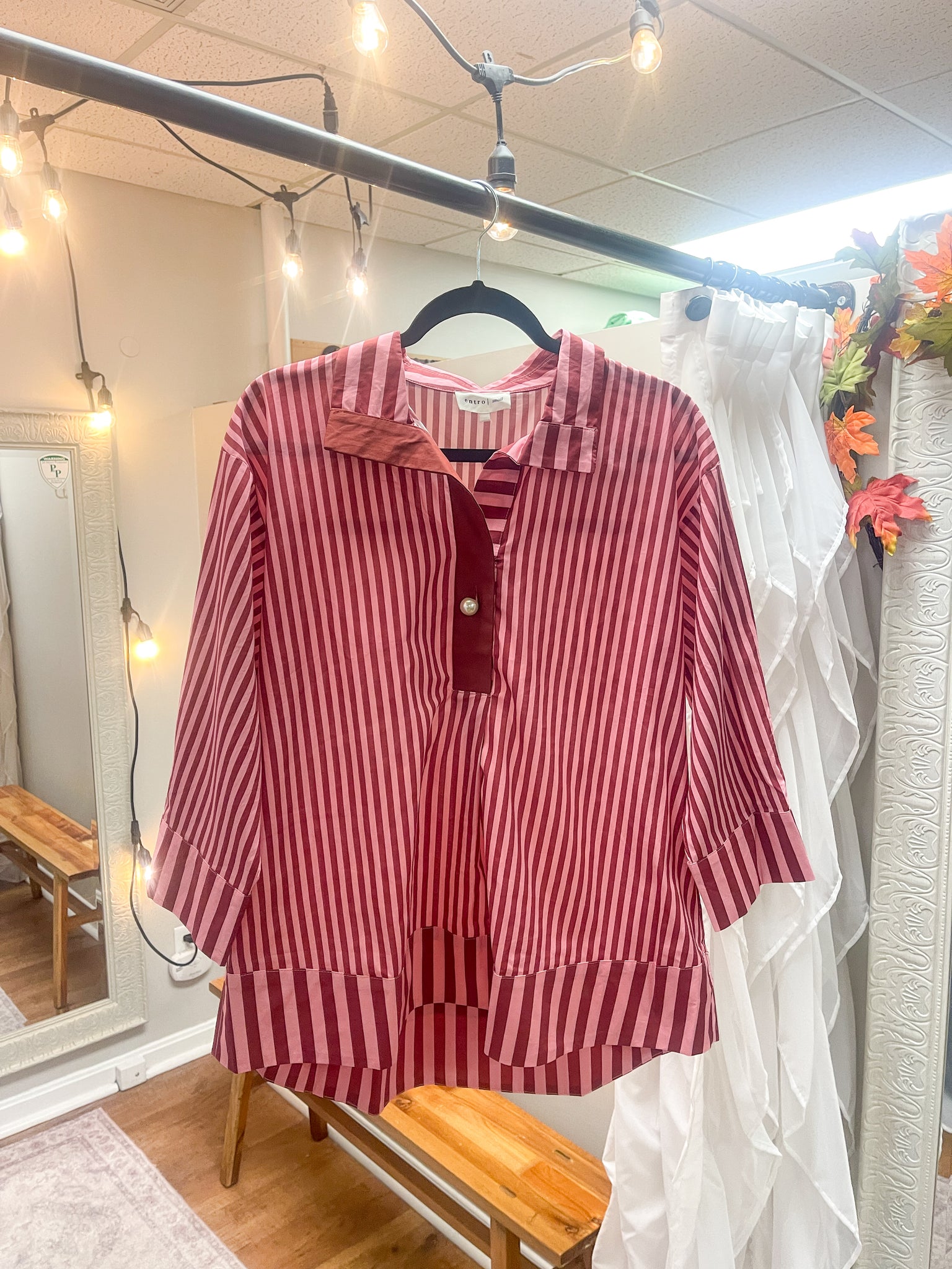 Brighten your day with the Burgundy & Pink 3/4 Sleeve Top, where cheerful stripes meet a wide collar for a charming look. Lightweight and easygoing, it features a hidden placket with a pearl button surprise and button closures at the cuffs—perfect for adding a playful twist to your everyday outfit.