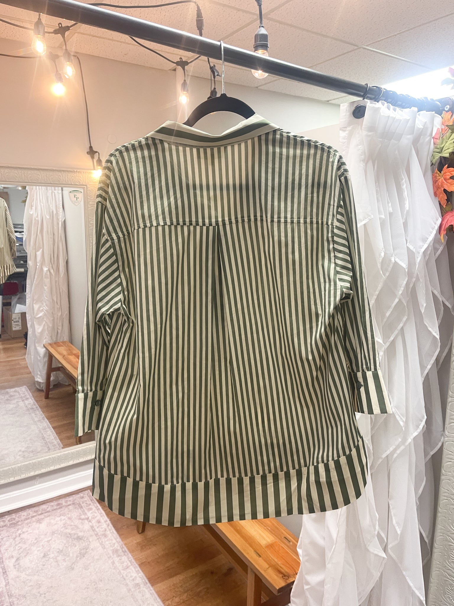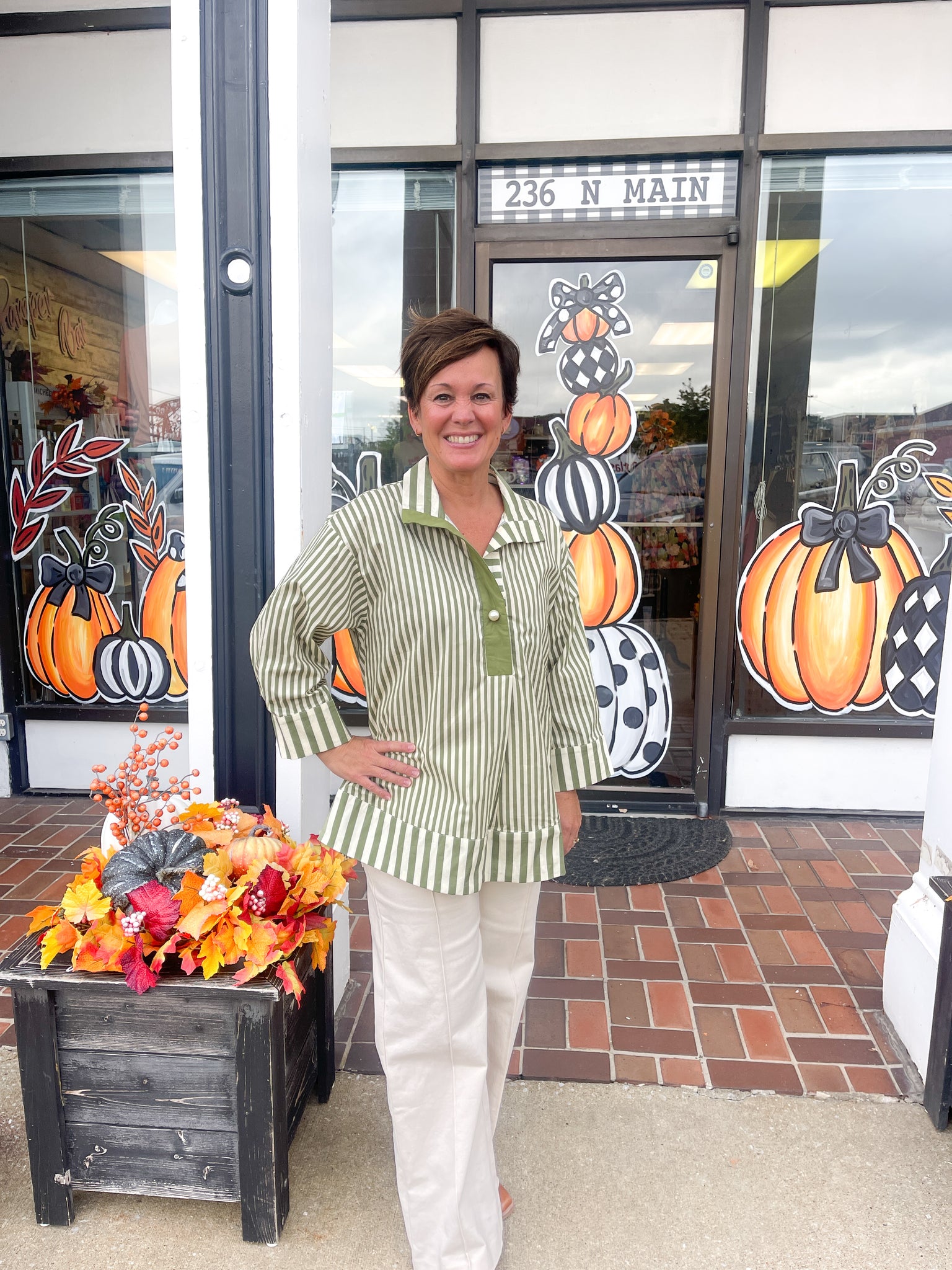 Brighten your day with the Olive 3/4 Sleeve Top, where cheerful stripes meet a wide collar for a charming look. Lightweight and easygoing, it features a hidden placket with a pearl button surprise and button closures at the cuffs—perfect for adding a playful twist to your everyday outfit.