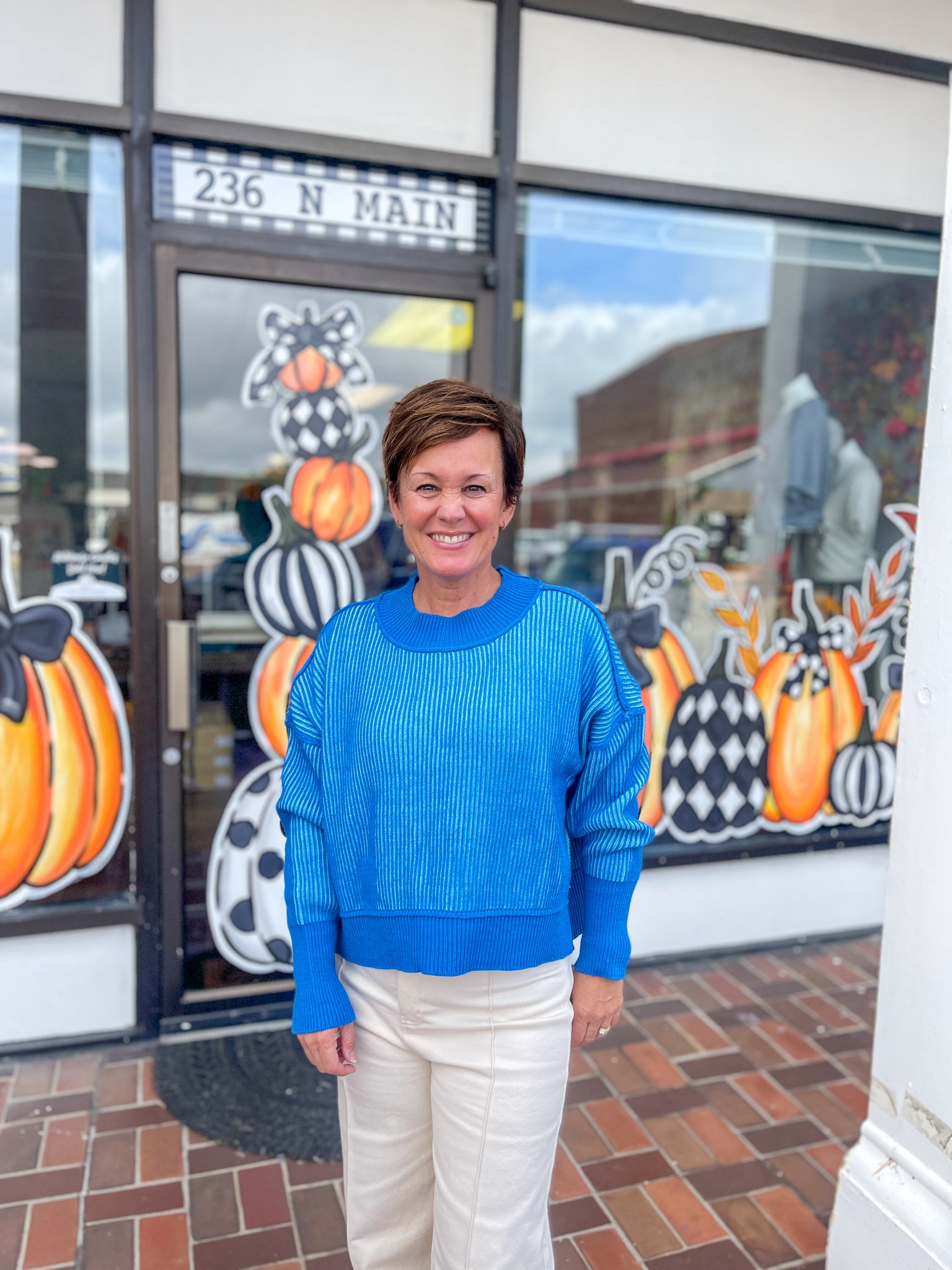 Stay cozy and stylish in the Two Tone Blue Exposed Seam Sweater, designed with playful hi-low hem and side slits for a fun twist on classic comfort. Perfect for game day or any day you want to bring a pop of color and casual cool to your outfit.